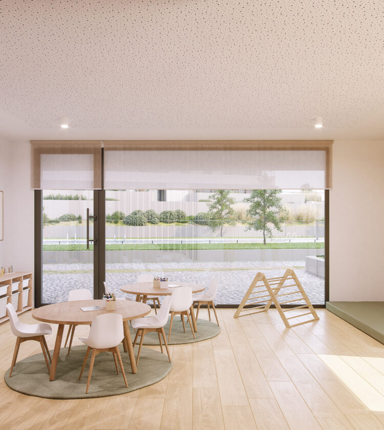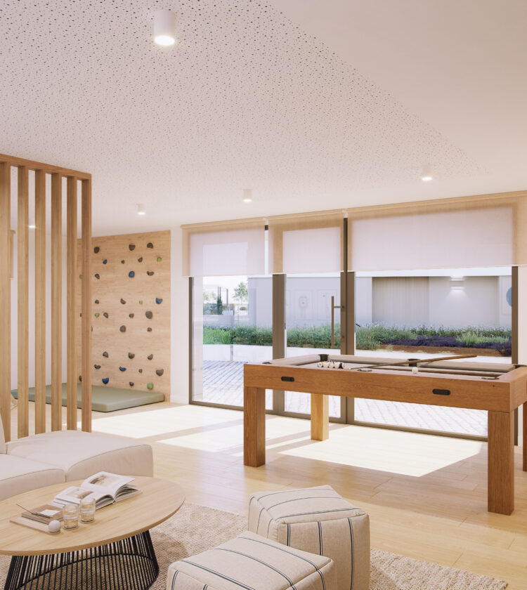 The communal areas of AQ Lumiria are designed for the enjoyment of the whole family: a large outdoor swimming pool surrounded by garden areas, a fully equipped gym, a modern gastro zone, and a playroom for the little ones.