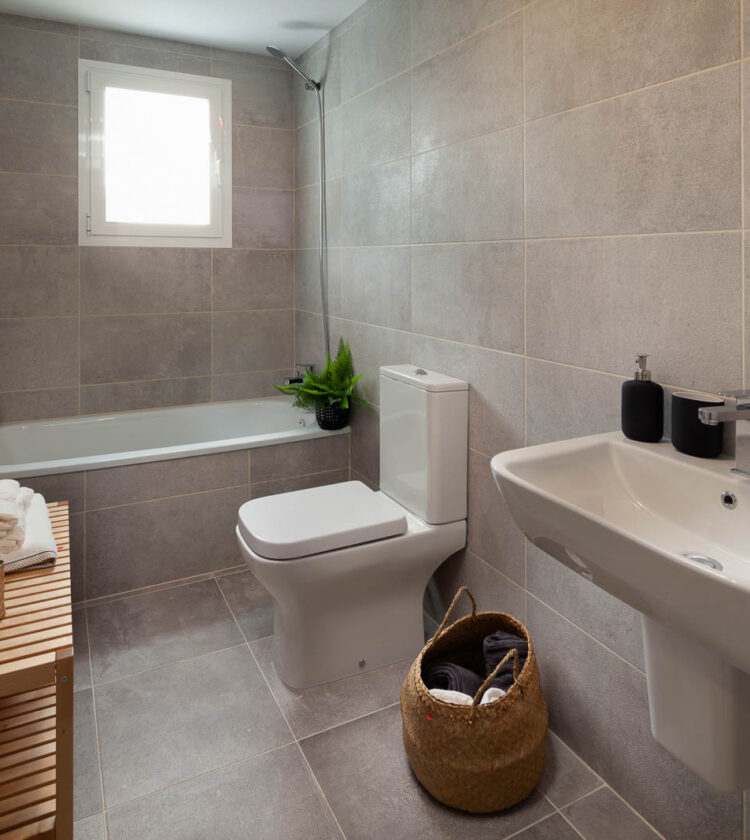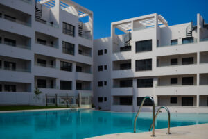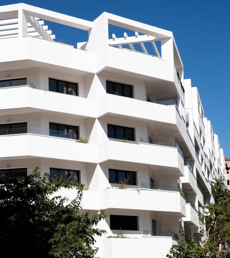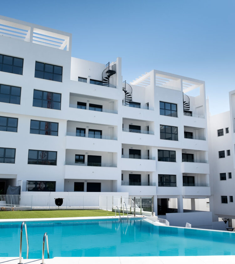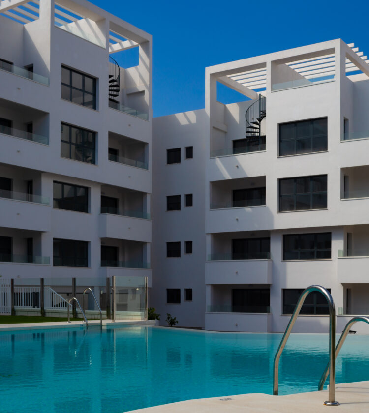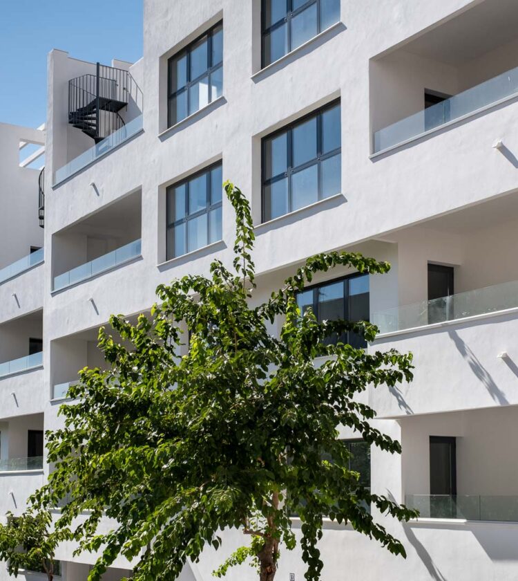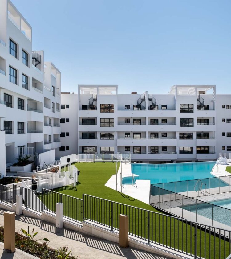 Las viviendas fueron diseñadas siguiendo criterios de funcionalidad, luminosidad y eficiencia. El complejo se organiza en forma de “L” alrededor de un jardín central de aproximadamente 2.500 m², que incluye una piscina infinita con zona infantil y áreas de juego.